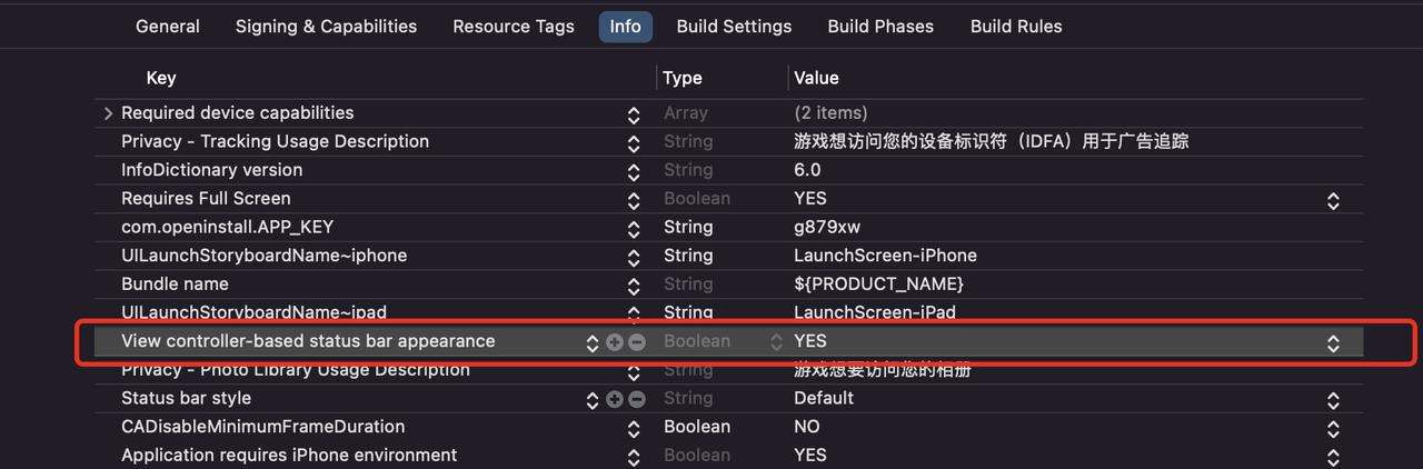 - info.plist 文件中添加如下配置(用来申请获取 IDFA 权限:描述一般为:'游戏名'想访问您的设备标识符(IDFA)用于广告追踪),如图所示: