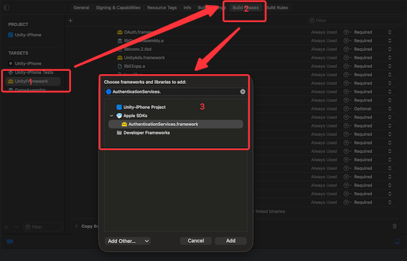 - 选中 UnityFramework target → Build Phases → Link Binary With Libraries