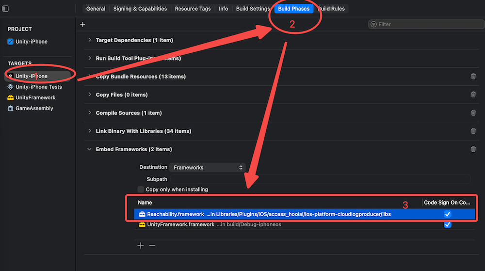 - 选中 Unity-iPhone target → Build Phases → Embed Frameworks
